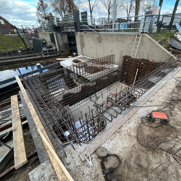 Aan de benedenstroomse zijde van de sluis hebben we 2 betonnen bordessen op stalen buispalen gemaakt waar de kroosreinigers op staan. Naast de bordessen hebben we betonnen opvangbakken gemaakt waarin het kroos gestort kan worden. Tevens zijn aan de bovenzijde de bestaande krooshekken vervangen door nieuw ontworpen exemplaren.