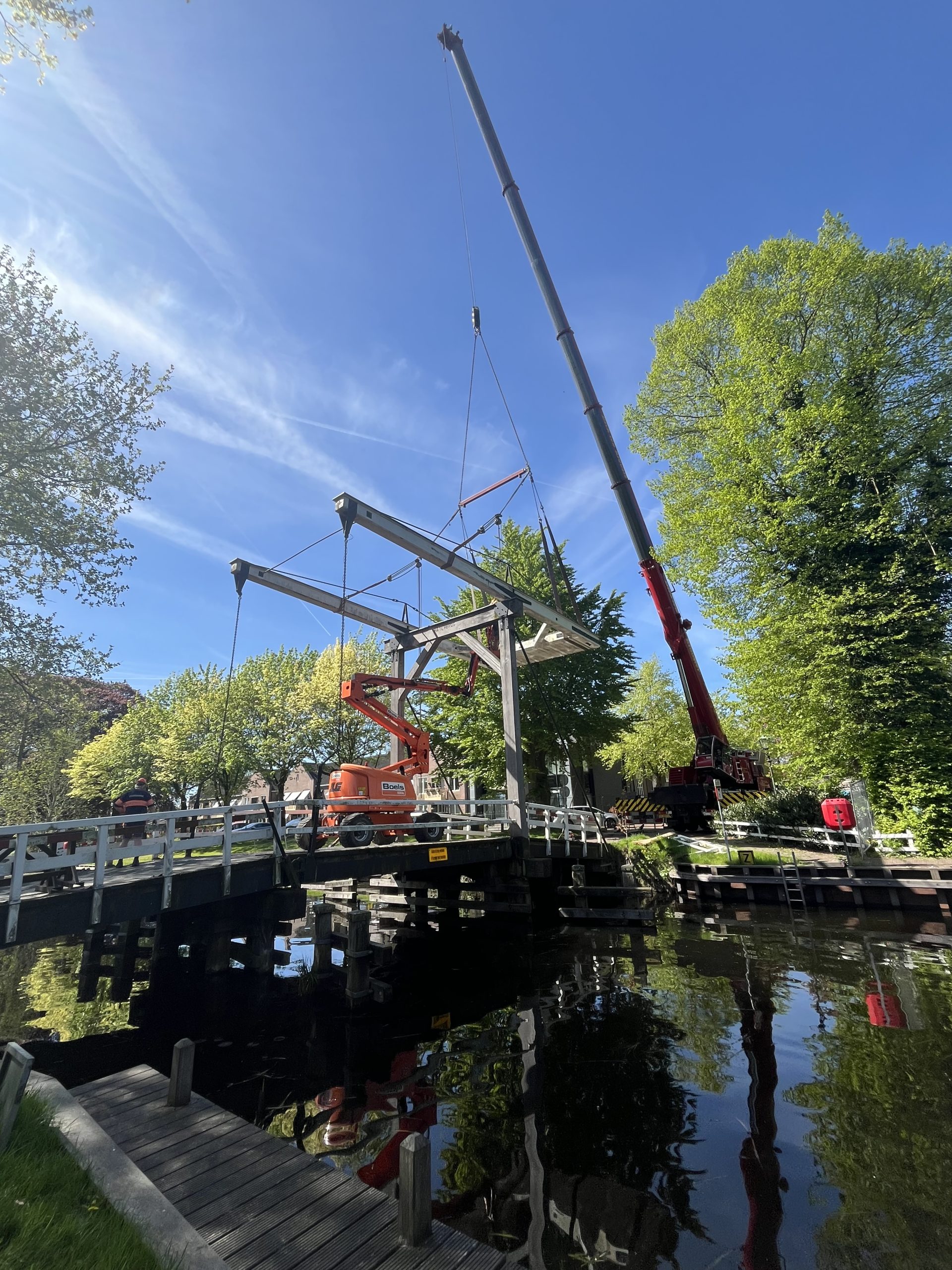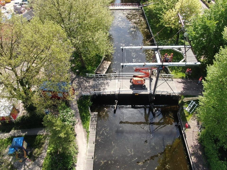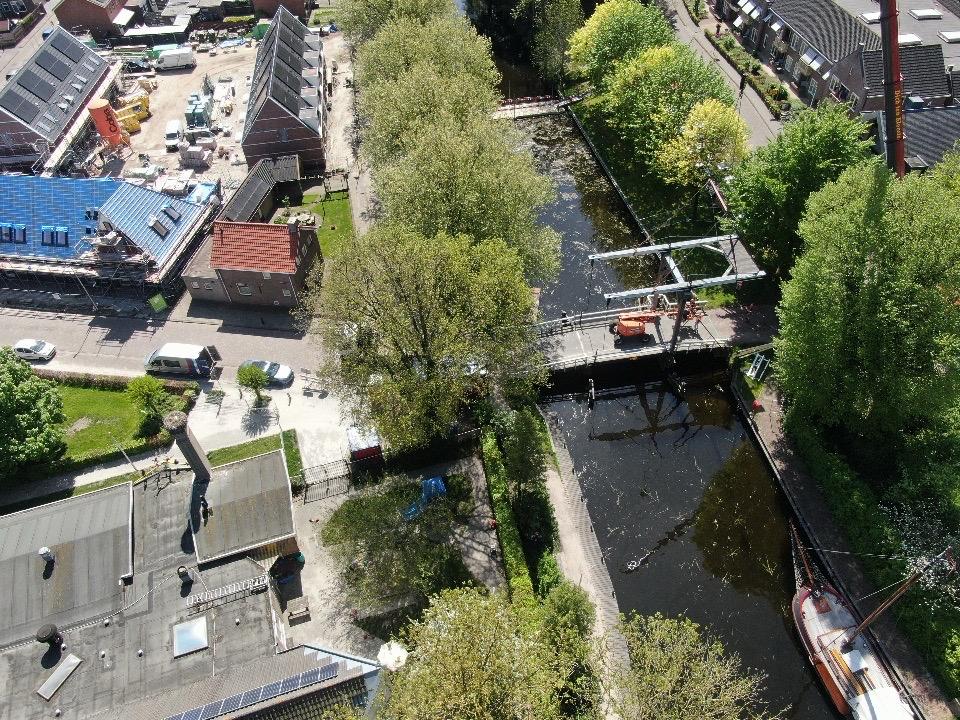 De andere brug blijft beweegbaar. De betonnen dekdelen worden prefab geproduceerd in onze werkplaats en als een geheel ingehezen. Door de ligging midden in het toeristische centrum is er weinig ruimte en is bereikbaarheid belangrijk. Daarom is er voor fietsers en voetgangers een tijdelijke noodbrug geplaatst.